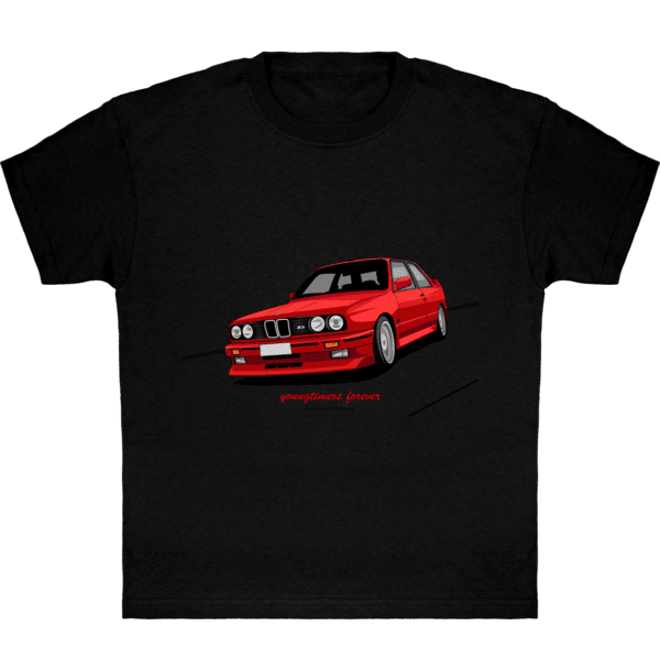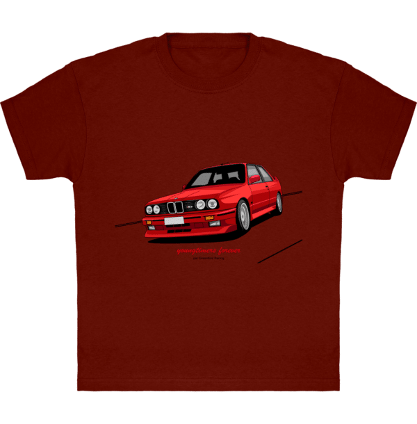 T-shirt enfant personnalisé avec un dessin de BMW M3 E30 rouge en impression.